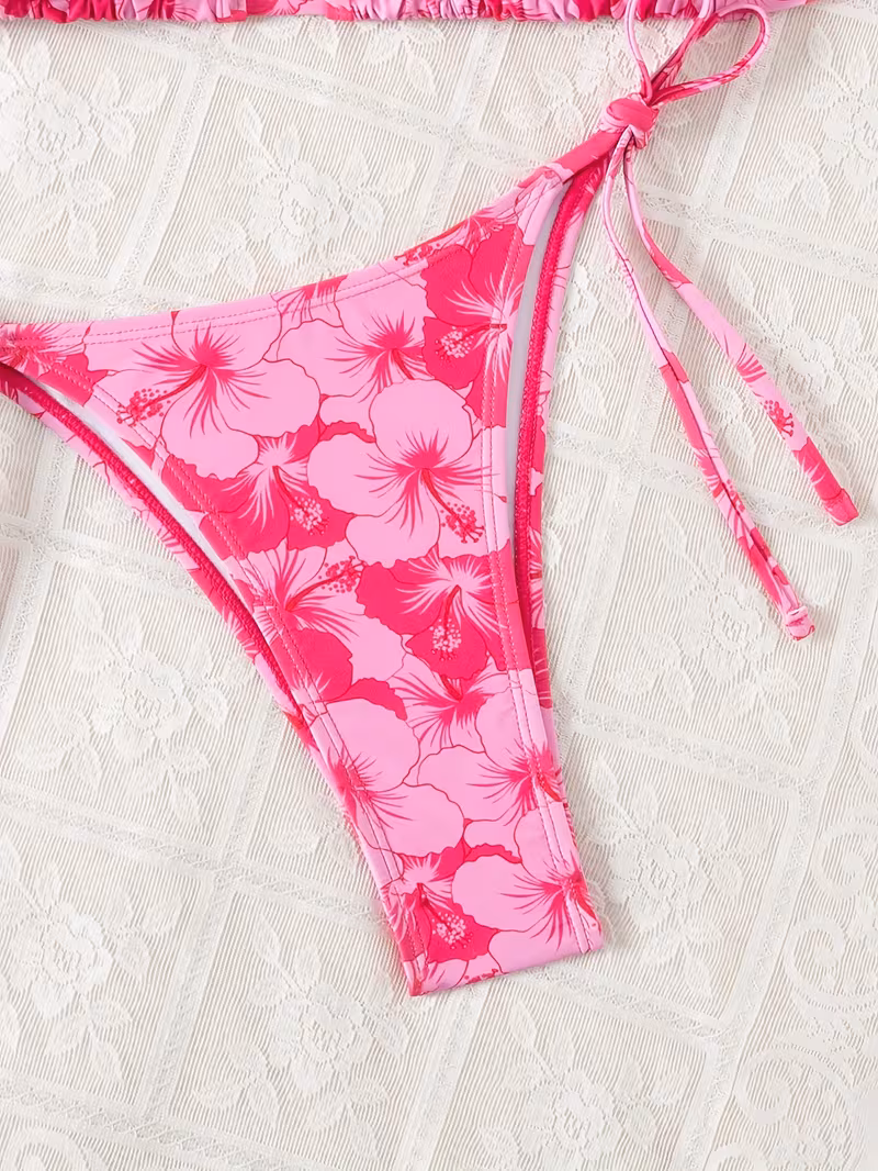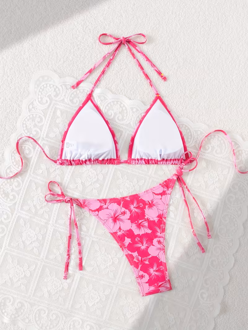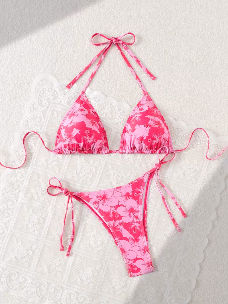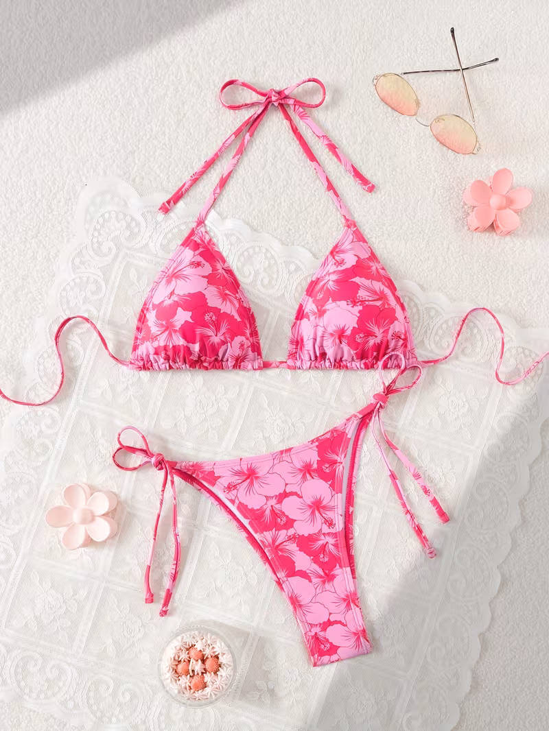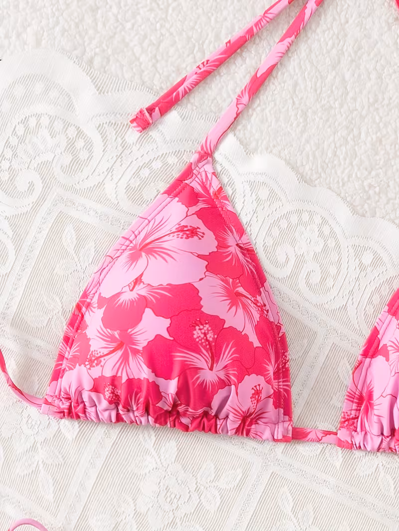 Turn heads in this Floral Print Triangle Halter Bikini Set, the perfect blend of playful charm and effortless allure. Designed with a classic triangle top and adjustable tie-back closure, it offers a flattering, customizable fit that moves with you. The stretchy, comfortable fabric hugs your curves while the vibrant floral print adds a fresh, feminine touch. Ideal for beach days or poolside lounging, this two-piece set brings confidence and style to every sunny moment.